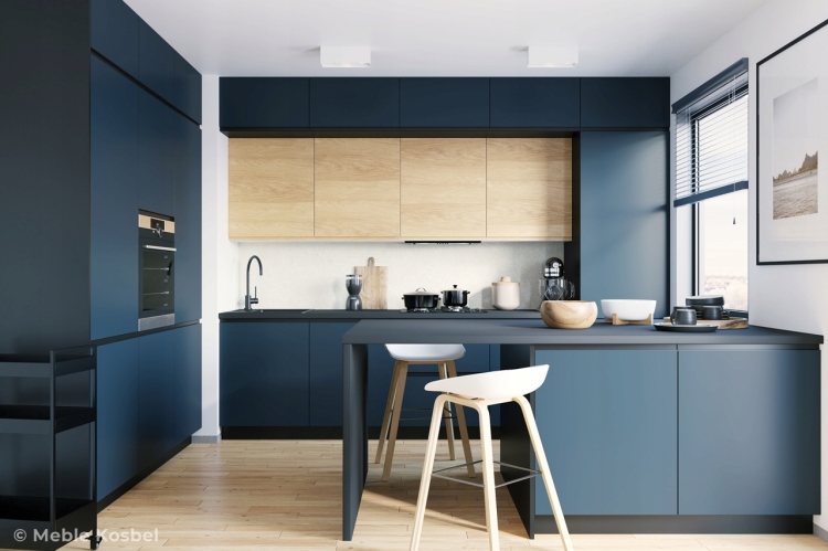 W kuchni zastosowano korpus LAVA, fronty szafki dolne EDEN NAVY (podchwyt czarny),szafki górne MADERA HIKORA uchwyt frezowany, blat DARK GREY CONCRETE.
