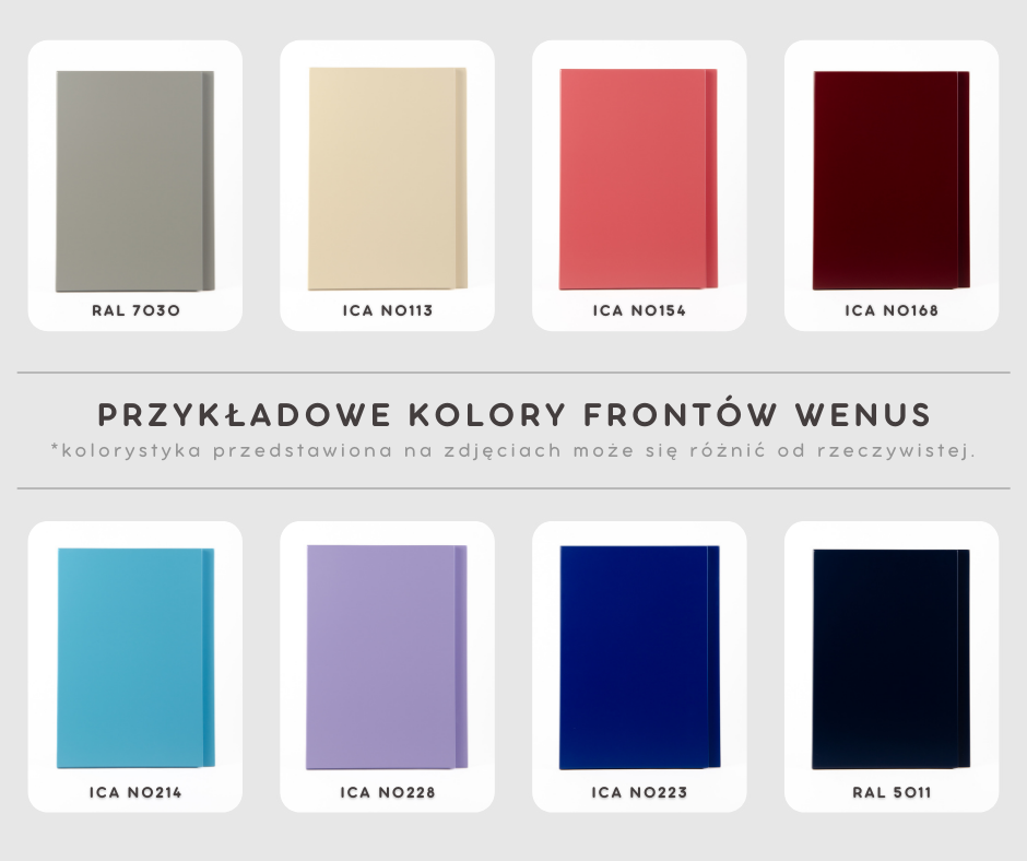 - Informacja o pokrycu frontu UWAGA! Lakierowanie i laminowanie frontów obejmuje wyłącznie przód i krawędzie - tył frontu lakierowanego oraz laminowanego (z wyjątkiem frontów drewnopodobnych) ma kolor biały.