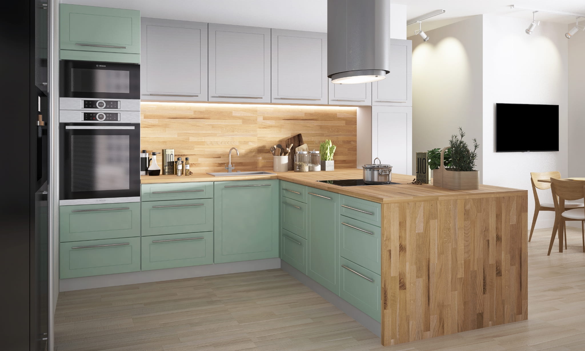 W kuchni zastosowano korpus GREY, fronty MINT oraz DUST GREY, uchwyt U2 (reling chrom)