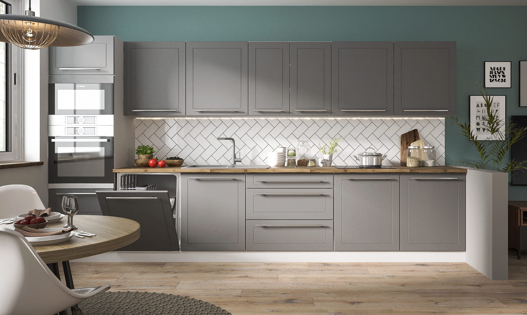 W kuchni zastosowano korpus BIAŁY, fronty GRAPHITE, uchwyt U2 (reling chrom)