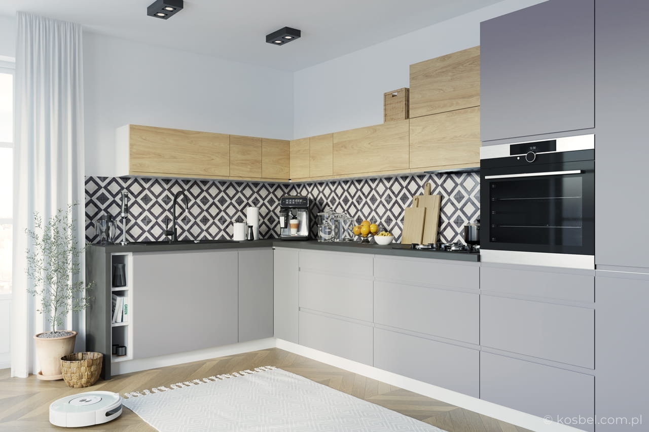 W kuchni zastosowano korpus BIAŁY, fronty szafki dolne SEVILLA DUST GREY oraz szafki wiszące MADERA HIKORA, uchwyt frezowany, blat DARK GREY CONCRETE.