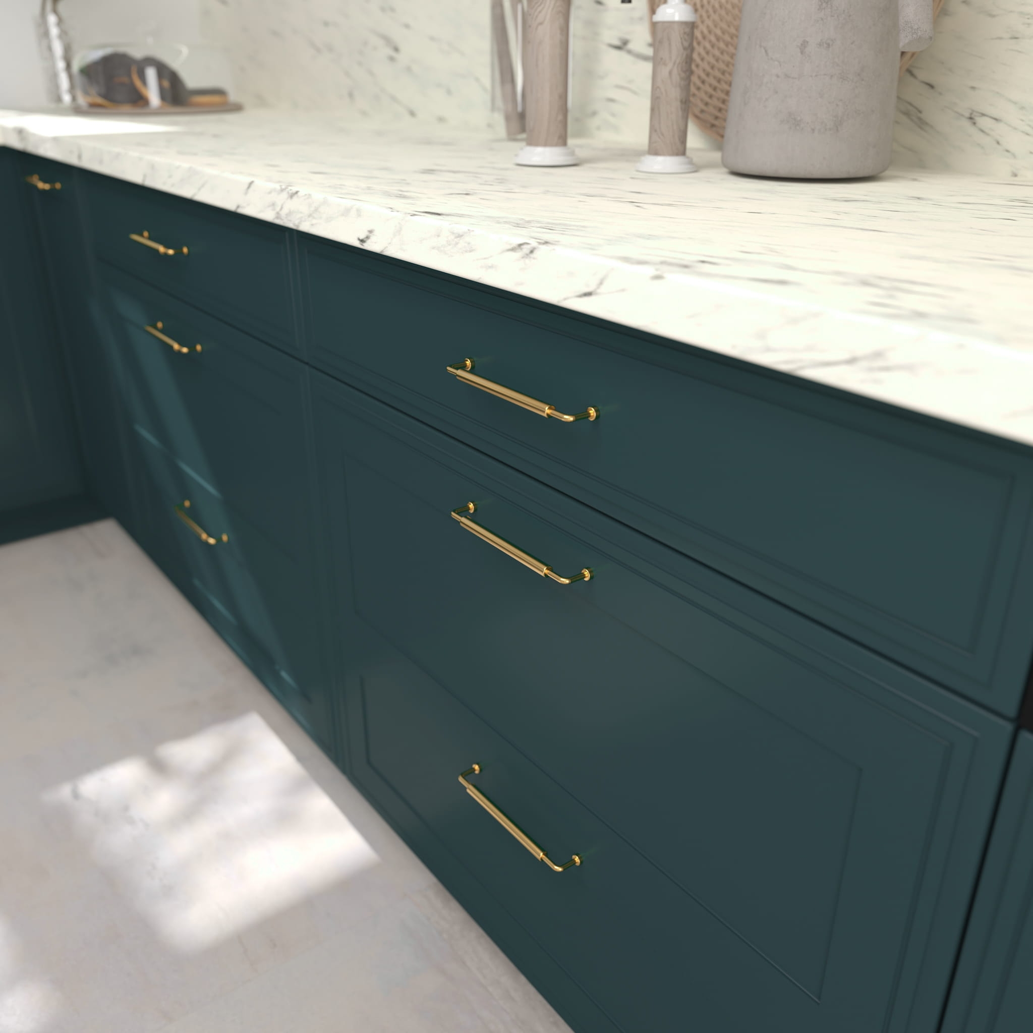 NIESTANDARDOWA WYSOKOŚĆ FRONTU - szafka z dłuższą wysokością frontu niż standardowy zapewnia bezuchwytowe otwieranie szafki; front wystaje poniżej dolnej części korpusu.