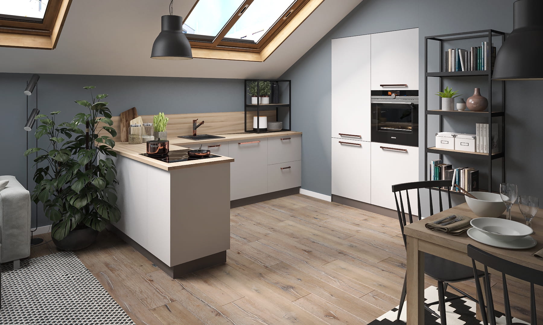 W kuchni zastosowano korpus LAVA, fronty BIAŁY uchwyt UU52, blat DĄB SONOMA.