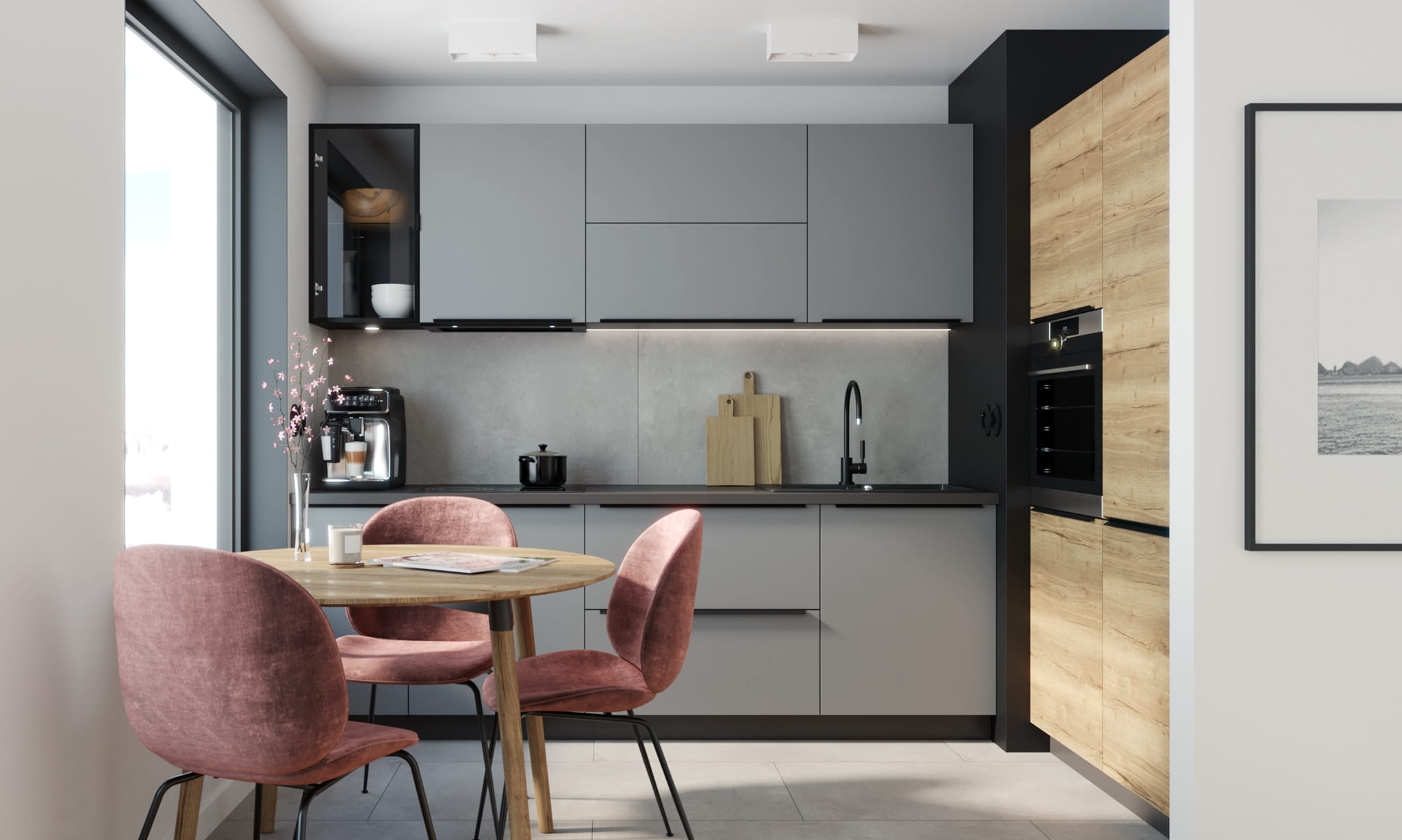 W kuchni zastosowano korpus LAVA, fronty DUST GREY oraz PORTO HALIFAX, uchwyt UA 112 dostosowany do szerokości frontu, blat DARK GREY CONCRETE.
